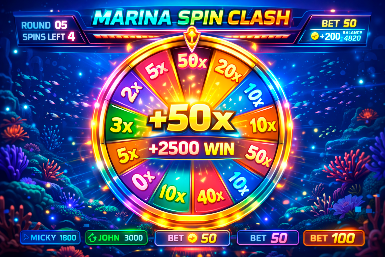 A multiplier wheel designed for quick social duels. Pick a bet, spin the wheel, and post your highest net gain to your friend chat.