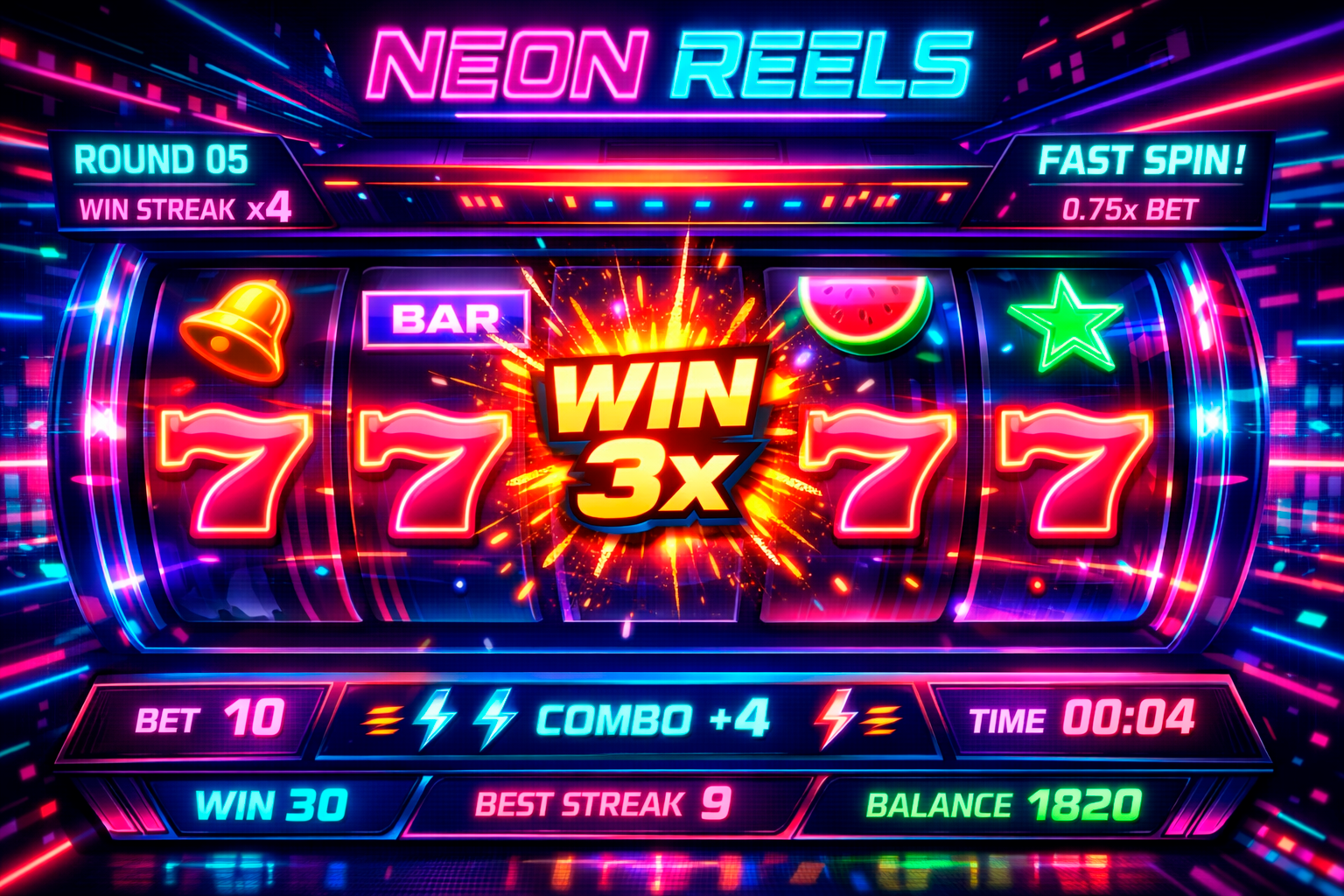 A high-energy reel game with fast rounds, symbol combos, and instant feedback. Tune your bet, spin, and chase streak-based achievements.